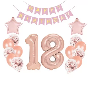 Zestaw na 18 urodziny w najmodniejszym kolorze ROSE GOLD. W skład zestawu wchodzą : 2 balony 100 cm cyfry 1 i 8 rose gold 2 balony 18 cali rose gold w kształcie gwiazdek 6 balonów lateksowych przezroczystych 12 cali z rose gold konfetti 6 balonów lateksowych rose gold 12 cali Girlanda różowa ze złotym napisem Happy Birthday Idealna dekoracja sali na przyjęcie urodzinowe. Jest to gotowy zestaw, dzięki czemu nie musisz bawić się w dobieranie odpowiednich akcesoriów czy kolorów! Zestaw w oryginalnym opakowaniu producenta, z certyfikatem CE. Do nadmuchania helem lub powietrzem.