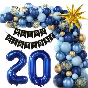 ZESTAW BALONÓW BALONY NA 20 URODZINY 136 SZT Idealna kompozycja dekoracji na imprezę urodzinową. W zestawie znajdują się: Zestaw zawiera: girlanda czarna ze złotym nadrukiem Happy Birthday-1szt balon cyfra 32" granatowa 2 -1szt balon cyfra 32" granatowa 0-1szt balon 3d gwiazda złota -1szt balon granatowy: 10"-30szt, 5"-10szt balon niebieski metaliczny: