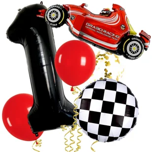 Zestaw balonów 6 szt. - 1 szt. Balon foliowy cyfra urodzinowa ok 100 cm - 1 szt. Balon foliowy bolid ok 52 x 110 cm - 1 szt. Balon foliowy race koło z szacho...