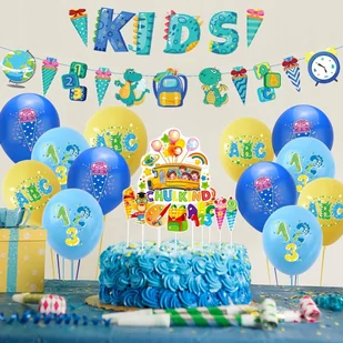 zestaw urodzinowy w zestawie: girlanda KID + tasiemka toppery na tort i babeczki duże balony lateksowe z nadrukiem 16x