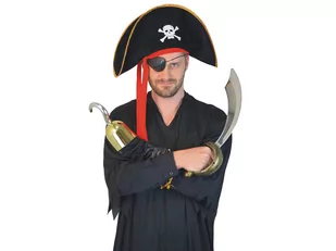 Kapelusz Kapitański dla Kapitana/Kapitanki Pirata to niezbędny element przebrania jeśli wybierasz się na Pirackie Party lub szukasz uzupełnienia Twojego przebrania na bal przebierańców. Materiałowy czarny kapelusz ze złotym obszyciem oraz białą czaszką. Dodatkowo kapelusz ozdobiony czerwoną zwisającą wstęgą.
