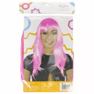 Peruka wykonana z włosów syntetycznych w kolorze różowym. Długa fryzura z grzywką. Dopełnienie stylizacji, przebrania na bal karnawałowy, sylwestrowy, halloween. Długość włosów to około 50 cm. Peruka w rozmiarze uniwersalnym.