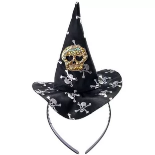 Mały kapelusz czarownicy w kolorze czarnym mocowany na opasce - dzięki czemu nie spada z głowy. Super dodatek dla Halloweenowej czarownicy. Kapelusz posiada wzór czaszek i aplikacje złotej czaszki.