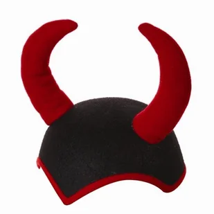 czapka na głowę diabełka/ diablicy wykonana z usztywnionego filcu w kolorze czarnym obszyta czerwoną lamówką z rogami w tym samym kolorze obwód: 52 cm wysoko...