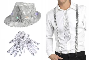 KAPELUSZ Z DIODAMI + SZELKI CEKINOWE DO SPODNI SREBRNE + KRAWAT RĘKAWICZKI