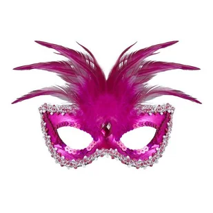 Maska Wenecka Różowa Maska na oczy w stylu weneckim, wykonana z usztywnionego materiału. Zdobina cekinami, tasiemką, piórami i diamentem.