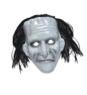 maska zjawa maska koloru popielatego z doczepionymi, czarnymi włosami wykonana z tworzywa sztucznego mocowana na gumce w masce wycięte otwory na oczy i nos