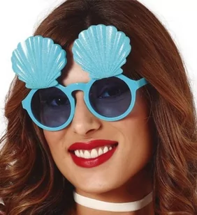 Okulary w kolorze błękitnym z muszlami. Wykonane z tworzywa sztucznego. Posiadają szkła w kolorze ciemnoniebieskim.