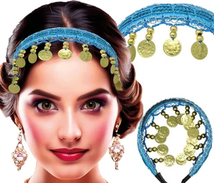 Opaska Złote Monety – Egzotyczna Ozdoba w Kolorze Niebieskim Przenieś swoją stylizację na zupełnie nowy poziom dzięki efektownej opasce na głowę ze złotymi m...