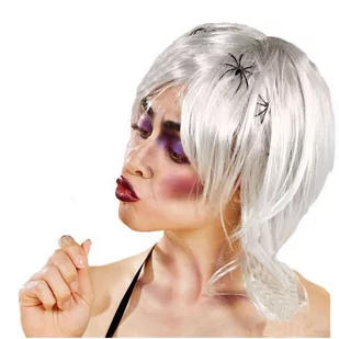BIAŁA PERUKA z grzywką i.... pająkami to świetny dodatek do przebrania na HALLOWEEN. Pająki przymocowane są do białych włosów.