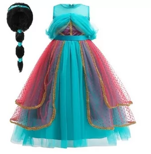 NOWY WZÓR PRZEŚLICZNEJ SUKIENKI JASMINY : ) OFERTA DOTYCZY STROJU W ROZMIARZE 104/110 cm (na metce 110) STRÓJ PRZEBRANIE JASMINA DŻASMINA SUKIENKA + PERUKA Opis produktu: Kostium odwzorowany na podobieństwo sukni balowej noszonej przez Księżniczkę Dżasmin z bajki pt. "Aladyn", Przebranie posiada szyfonowe elementy ozdobione brokatem, które nabierają piękna podczas tańca, Do zestawu z sukienką dołączamy perukę Suknia wykonana z pięknych materiałów w odcieniach koloru niebieskiego i czerwonego, Całość sukni dopełniona złotymi akcentami, Sukienka na bawełnianej podszewce, składająca się z 1 warstwy atłasowej halki oraz 2 warstw tiulu, Sukienka jest na ramiączka, Długość sukni 3/4 (za połowę łydki), Zapinana na zamek błyskawiczny. Idealna sukienka, strój na bal, karnawał, urodziny, do codziennej zabawy.