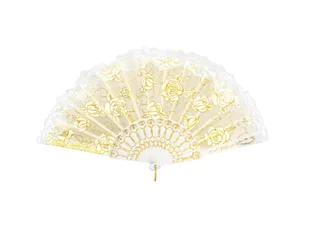 Wachlarz ze złotymi różami i białą koronką. Wielkość: 25 cm. Opakowanie: 1 szt.