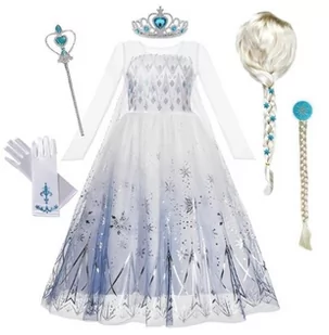 Rozmiar 134/140 (z metki 130) Długość całkowita sukienki - 96 cm Szerokość pod paszkami - 32 cm Szerokość w pasie - 30 cm Długość rękawa od pachy - 32 cm Kostium dla dziewczynki w wieku 9-10 lat Wymiary mierzone ręcznie, na płasko. Dopuszczalny błąd pomiaru +/-2 cm. Strój idealny dla małych dziewczynek, a zwłaszcza dla Wielbicielek animacji Krainy Lodu, dobrze wykonany, w odcieniach błękitu i bieli. Dzięki naszej propozycji każda dziewczynka może poczuć się jak jej ulubiona bajkowa postać. Ciekawe przebranie to zawsze podróż do magicznej baśniowej krainy, która pozwoli zachować dzieciństwo w pamięci.