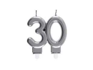 Świeczka cyferka "30" srebrna, idealna na trzydzieste urodziny. Udana trzydziestka. Wymiary: 9 x 7,5 cm. Opakowanie: 1 szt.