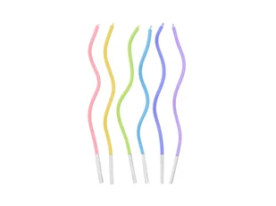 Świeczki urodzinowe zakręcone w pastelowych kolorach: żółtym, różowym, niebieskim, fioletowym i zielonym.