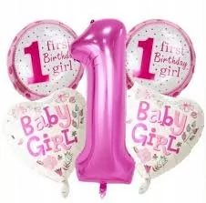 Zestaw balonów foliowych na pierwsze urodziny dla dziewczynki. Ilość: 5szt - 1x cyfra 1 różowa, 2x różowe serce z nadrukiem "Baby girl", 2x okrągłe z nadrukiem " 1 birthday girl". Rozmiar: 18" - ok. 45cm średnicy, Balon cyfra 1 ok. 85 cm Balony nadają się do napełnienia powietrzem lub helem.