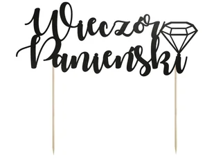 Napis Wieczór Panieński na piku w kolorze czarnym, idealna dekoracja tortu na Wieczór Panieński. Napis wycięty w sztywnym, błyszczącym papierze dzięki czemu daje wspaniały efekt. Zestaw DIY. Wielkość: dekoracja 20x8 cm, patyczek 11 cm. Opakowanie: