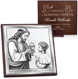 Personalizowany kwadratowy obrazek na i komunię świętą Elegancki obrazek w kształcie kwadratu to idealny prezent na Pamiątke Pierwszej Komunii Świętej , który łączy tradycję z nowoczesnością - stwórz unikalną pamiątkę na długie lata. Nadruk został wykonany na lustrze w technologii Silver-Print. Zachwyca precyzyjnymi detalami i wyjątkową trwałością. Postacie nadrukowane na lustrzanym tle harmonijnie współgrają z jego srebrnym połyskiem, uwydatniając duchowy wymiar pamiątki. Całość umieszczono na drewnianej orzechowej płycie , z możliwością personalizacji dedykacja grawerowana na odwrocie.