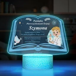 Lampka 3d z nadrukiem dla wnuka na komunię Zbliża się dzień pierwszej komunii świętej Twojego wnuka? Szukasz podarku dla chłopca na komunię ? To ma być coś z dedykacją od babci ? Nie wiesz, co kupić dla bliskiej osoby na wyjątkową okazję? Personalizowana lampka LED z nadrukiem 3D na szkle akrylowym to doskonały pomysł na prezent! Tabliczka akrylowa ustawiona została na solidnej podstawce z tworzywa sztucznego . Do jej zasilenia służy długi kabel USB . Lampkę podłączysz do komputera lub bezpośrednio do gniazdka z wejściem USB. Oryginalną lampkę 3D zasilą również standardowe 3 baterie AA. Kolory takie jak:
