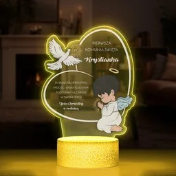 Lampka 3d z nadrukiem dla chłopca na komunię Jesteś ojcem chrzestnym? Szukasz podarku dla chłopca na komunię ? Nie wiesz, co kupić dla bliskiej osoby na wyjątkową okazję? Personalizowana lampka LED z nadrukiem 3D na szkle akrylowym to doskonały pomysł na prezent! Tabliczka akrylowa ustawiona została na solidnej podstawce z tworzywa sztucznego . Do jej zasilenia służy długi kabel USB . Lampkę podłączysz do komputera lub bezpośrednio do gniazdka z wejściem USB. Oryginalną lampkę 3D zasilą również standardowe 3 baterie AA. Kolory takie jak: