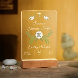 Personalizowana ramka led z nadrukiem na komunię Niedawno zostaliście rodzicami chrzestnymi? Nie wiecie, co kupić dla dziewczynki na komunię ? A może wybierasz pamiątkę komunii świętej dla wnuczki? Nie wiesz, co kupić dla bliskiej osoby na wyjątkową okazję? Personalizowana ramka z podświetleniem LED i nadrukiem to doskonały pomysł na prezent! Tabliczka akrylowa ustawiona została na solidnej, drewnianej podstawce . Do jej zasilenia służy długi kabel USB . Lampkę podłączysz do komputera lub bezpośrednio do gniazdka z wejściem USB. Ta personalizowana lampka z nadrukiem ma możliwość wyboru koloru oświetlenia . Piękna statuetka ozdobi biurko, półkę, komodę i regał w Twoim mieszkaniu.