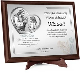 Obrazek z życzeniami i decykacją na komunię świętą Obrazek z życzeniami i dedykacją to wyjątkowy sposób na uczczenie ważnych chwil, takich jak I Komunia Święta . Elegancka forma, trwałość wykonania i starannie dobrane detale sprawią. że ten niepowtarzalny prezent zyska szczególne miejsce w sercu obdarowanego. Drewniany podkład w kolorze ciemnego brązu podkreśla ponadczasowy charakter, a nadruk z dedykacją na aluminiowej płycie gwarantuje jego trwałość i estetykę . Obraz w serduszku ukazuje Jezusa udzielającego Komunii Świętej dziewczynce w białej sukience.
