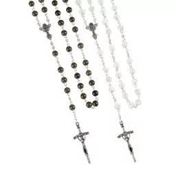 Różaniec do Pierwszej Komunii - szkło - 6 mm Różańce pierwszokomunijne dla chłopca lub dziewczynki. Różańce ze szkła transparentnego w kolorze białym lub czarnym. Paciorek o kształcie kulki. Sztyft ze stali nierdzewnej. Rozmiar paciorka: