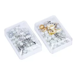 Różaniec komunijny, szklany z perłą Pierwszokomunijny różaniec szklany w pudełeczku z symbolem IHS. Dla chłopca i dziewczynki. Koraliki o kształcie kuli pokryte masą perłową. Elementy metalowe różańca ze stali nierdzewnej. Rozmiar paciorka:
