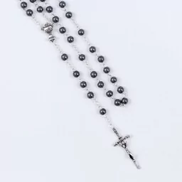 Różaniec - Pierwsza Komunia Święta - 6 mm - hematyt - Ematite Różaniec do pierwszej Komunii Świętej posiada wyjątkowe koraliki z kamienia naturalnego zwanego -hematyt. Paciorki w kształcie kuli. Sztyft ze stali nierdzewnej. Rozmiar koralika: 6 mm