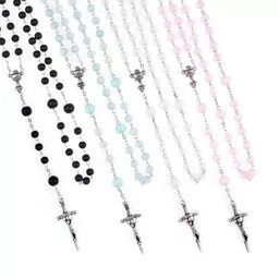 Różaniec - Pierwsza Komunia Święta - szkło mrożone Różaniec do Pierwszej Komunii dla chłopca lub dziewczynki w czterech kolorach. Czarny, niebieski, bezbarwny oraz różowy. Koralik z efektem mrożonego szkła. Sztyft ze stali nierdzewnej. Rozmiar paciorka:
