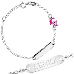 Bransoletka srebrna różowy kotek Bransoletka została wykonana z wysokiej jakości srebra próby 925 . Bazą kompozycji jest łańcuszek o masywnym splocie typu Rolo . Bransoletka jest dedykowana dla dzieci. Jej długość jest regulowana w zakresie od 13 do 17 cm . Zwieńczeniem kompozycji jest wesoły różowy kotek oraz podłużna aplikacja w formie blaszki, umożliwiająca wygrawerowanie np.