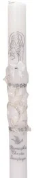 Świeca do Chrztu z białą kokardą Świeca na Chrzest. Pięknie zdobiona pamiątka Chrztu Świętego. Srebrne napisy, złote kokardy oraz biała kokarda dodają uroku tej świecy do Chrztu Świętego. Wysokość: 40 cm Średnica: 3 cm