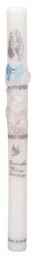 Świeca do Chrztu z niebieską kokardą Świeca na Chrzest. Pięknie zdobiona pamiątka Chrztu Świętego. Srebrne napisy, złote kokardy oraz niebieska kokarda dodają uroku tej świecy do Chrztu Świętego. Wysokość: 40 cm Średnica: 3 cm