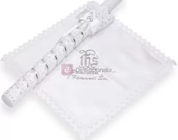 Zestaw IHS z koronki Bawełnianej Komplet składa się ze świecy oraz chusteczki. Świeca udekorowana została koronką bawełnianą oraz wstążką atłasową. Okapnik również wykonano z koronki. Chusteczka doskonale pasuje do świecy, obszyta tą samą koronka. Na szatce znajduje się haft do wyboru według wzorów oraz kolorystyka.