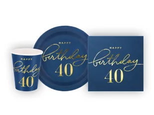 Zestaw papierowy w kolorze granatowym ze złotym metalizowanym napisem Happy Birthday 40, idealny na czterdziestkę, czterdzieste urodziny. W komplecie: