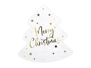 Piękne serwetki w kolorze białym z nadrukowanymi złotymi gwiazdkami oraz napisem Merry Christmas. Wspaniały dodatek na Boże Narodzenie, serwetki prezentują się bardzo oryginalnie. W zestawie 20 serwetek w kształcie CHOINKI.
