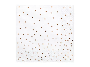 "Serwetki papierowe w kolorze białym z wzorem w kropki w kolorze różowego złota, wymiary po rozłożeniu ok. 33 x 33 cm, wymiary po złożeniu ok. 16.5 x 16.5 cm.(1 op. / 20 szt.