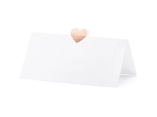 Wizytówka na stół, zwana też potocznie Winietką. W zestawie 10 sztuk białych winietek. Produkt z dodatkiem Serca w kolorze różowym złocie. Wizytówki mogą służyć jako klasyczne winietki - wpisujemy imię osoby i kładziemy na talerzu. Znajdą zastosowanie na wielu uroczystościach ślub, komunia czy garden party.