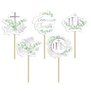 Pikery do babeczek Komunia Święta Eukaliptus srebrne, 5 szt. Pikery na tort/babeczki Komunia Święta Eukaliptus srebrny Wysokość z patyczkiem: ok. 9 cm Liczba sztuk w opakowaniu: 5 Nadruk jednostronny