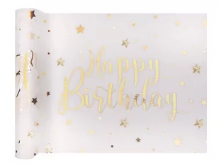 Gustowny bieżnik ze złotym metalicznym napisem Happy Birthday oraz gwiazdkami. Wyśmienity dodatek dekoracyjny na przyjęcie urodzinowe. Bieżnik ma 5 m długości i 30 cm szerokości, jest nawinięty na rolce.