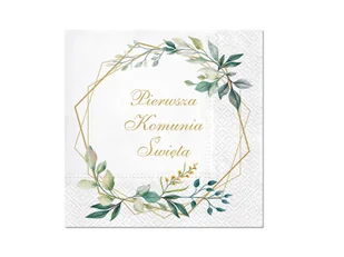 Serwetki w kolorze białym ze złotym napisem Pierwsza Komunia Święta i ramką z listkami.