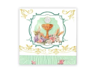 Serwetki 3-warstwowe w odcieniach zieleni z nadrukowanym złotym kielichem, idealne na I Komunię Świętą.