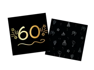 Serwetki 2-warstwowe papierowe w kolorze czarnym z urodzinowym nadrukiem oraz złotą liczbą 60.
