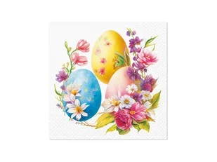 Serwetki papierowe z nadrukiem kolorowych pisanek z otaczającymi je kwiatami.