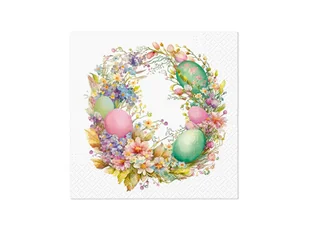 Serwetki papierowe z nadrukiem wielkanocnego wieńca z pisankami i kolorowymi kwiatami.
