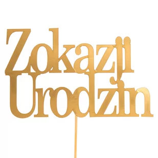Dekoracja tortów - topper papierowy w kolorze złota metalicznego. Przyklejony solidnie do patyczka. Używany przez florystów do zdobień bukietów lub Flower Boxów. Napis: Z OKAZJI URODZIN posiada rozmiar 15x9cm. Wysokość całościowa: