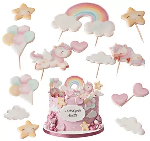 DEKORACJA CUKIERNICZA | NA TORT | JEDNOROŻEC | UNICORN | KONIK Zestaw do Dekoracji Tortu Wszystkie dekoracje są wykonywane ręcznie, dlatego mogą wystąpić niewielkie różnice w kolorach, wynikające z typowo rzemieślniczej charakterystyki wykonywanych produktów. Zestaw Zawiera: Jednorożec Biegnący (6 cm x 8 cm szer.) - 1 szt. Jednorożec Śpiący (4 cm x 8 cm) - 1 szt. Tęcza (8 cm x 12 cm) - 1 szt.