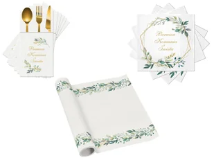 Zestaw dekoracji na stół na I Komunię Świętą w motywie listków.