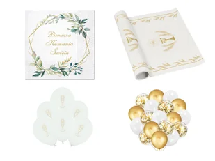 Zestaw dekoracji na stół na I Komunię Świętą.