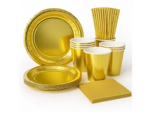 Zestaw urodzinowy w motywie złotym. W komplecie: - talerzyki - 18 cm - 6 szt., - kubeczki - 220 ml - 6 szt., - słomki - 20 cm - 24 szt., - serwetki - 33 cm - 20 szt. Opakowania: 56 szt.